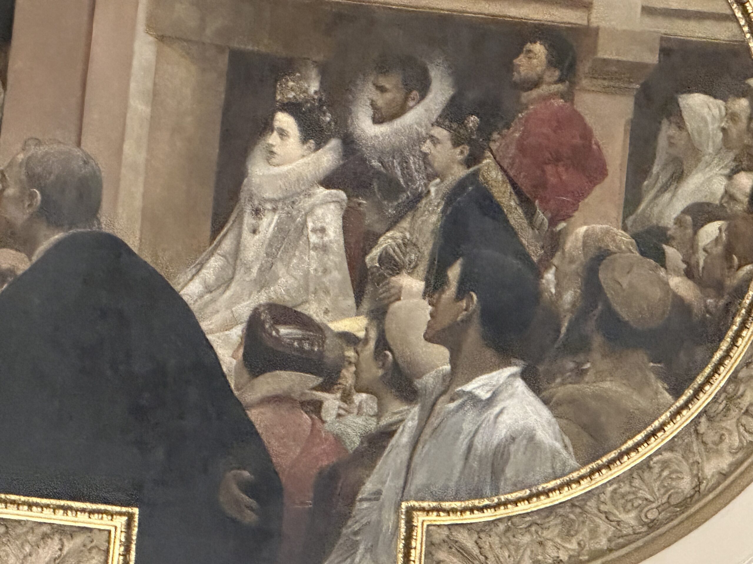 Во время климтовских юбилеев музей даже ставит конструкцию из строительных лесов, чтобы почитатели могли залезть под потолок и посмотреть работы поближе, на что художник, конечно, в свое время не рассчитывал. Но и стоя на парадной лестнице вы сможете различить работы Густава и Эрнста Климтов, и их коллеги Матча, если приложите некоторые усилия. Хотя художники стремились писать в одной манере, если вы уже натренировали глаз, то почерк каждого из них вы сможете узнать.
