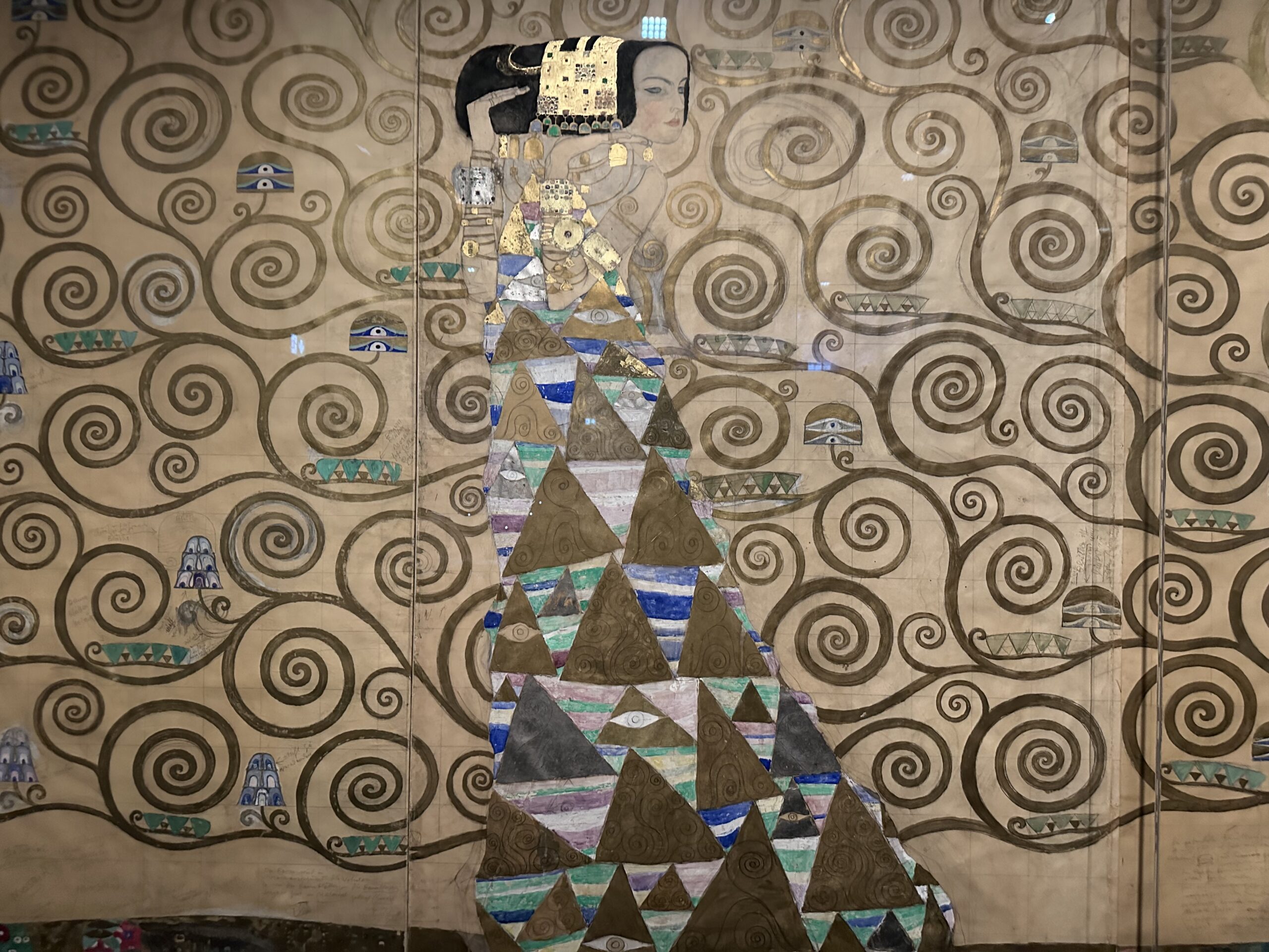 Учитывая, что для простых смертных попасть в дворец семьи Стокле практически невозможно, этот шедевр Климта возмоно лишь изучать по фотографиям и этому эскизу. Однако я бы не расстраивалась. Эскиз, на который на можете полюбоваться в Музее прикладного искусства, сделан Густавом Климтом собственноручно, а мозаики в брюссельском дворце — мастерскими. Новая экспозиция, открытая в феврале 2026 настолько выигрышно представляет фриз, что этот магический эффект, свойственный работам венского художника ощущается с невероятной силой.