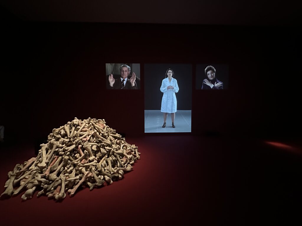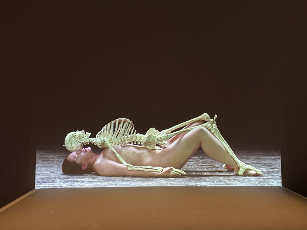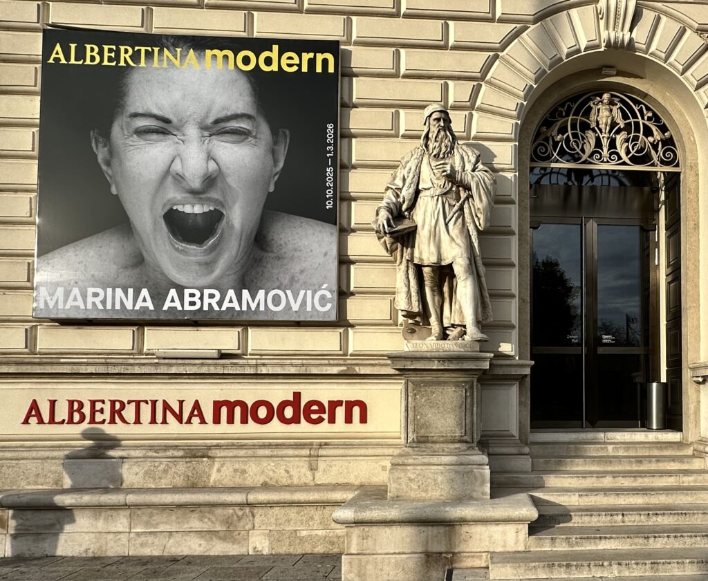 - 1. Плакат выставки Марины Абрамович на фасаде Альбертины Модерн, 2025. 2. Вид инсталляции Марины Абрамович «Балканское барокко» ( 1997, Венеция) в Альбертине Модерн. 3. Документация перформанса Марины Абрамович «Ритм 0» (1978, Неаполь) и реконструкция реквизита в Альбертине Модерн. 4. Видеоперформанс Марины Абрамович «Обнаженная со скелетом» (2002) в экспозиции Альбертины Модерн. 5. Видеодокументация перформанса «В присутствии художника» (Нью-Йорк, 2010) в Альбертине Модерн. Фотографии Юлии Абрамовой, октябрь 2025, Вена
