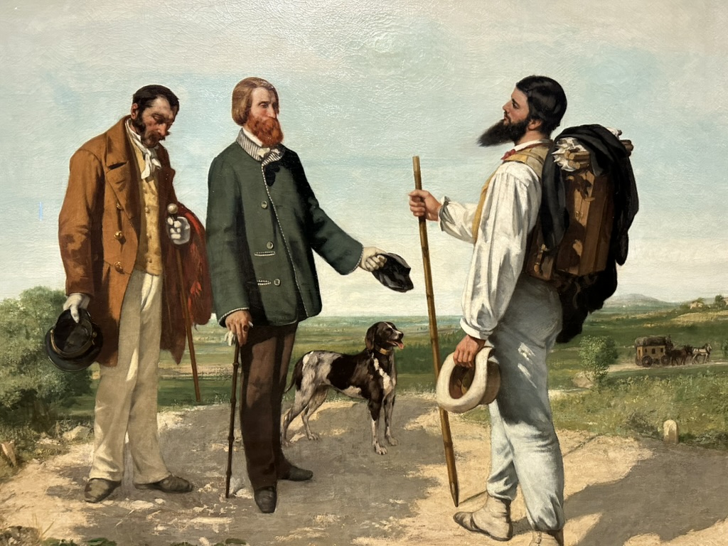Изображения Курбе окружены портретами тех, кто поставлял художнику пищу идеологическую (Шарль Бодлер, Пьер-Жозеф Прудон) и материальную (Альфред Брюйа). Брюйа на выставке отдано особое место. Помимо портрета в три четверти на выставку привезли «Здравствуйте, господин Курбе!», на которой изображена встреча художника и его главного мецената и которая часто обозначается как переломная в отношениях деньги — искусство.