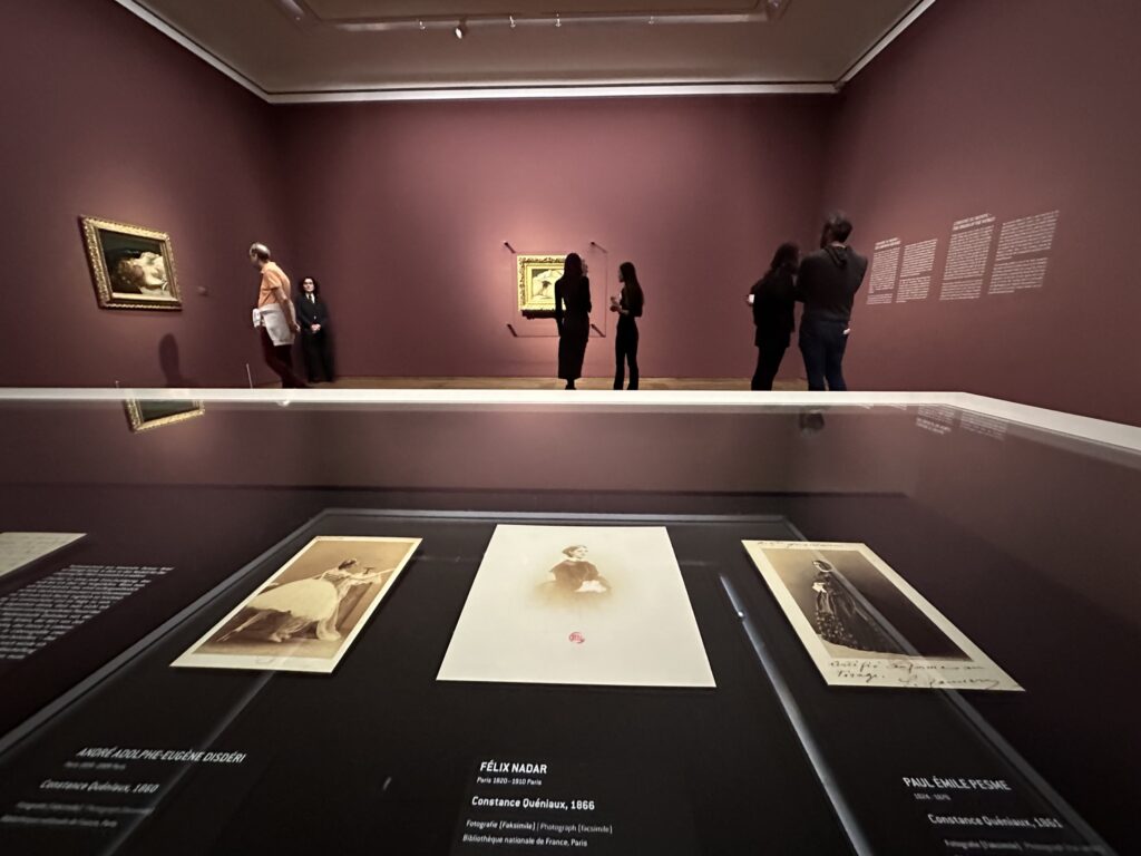 Закономерно, обнаженные женщины это самая «жареная» часть экспозиции и чтобы не провоцировать скандал больше, чем надо для маркетинга, сделана она сделано максимально сдержено. «Происхождение мира» под дополнительным защитным стеклом висит напротив «Спящих». Охранник рядом с картиной неизбежно превращает созерцание картины в акт демонстративной нескромности — вы смотрите на вульву, а охранник смотрит на вас практически фронтально. То чувство, которе можно испытать в музее Орсе, оставшись с картиной лицом к … лицу, в Леопольде невозможно. Вероятно, по другому нельзя было организовать просмотр, но это большая потеря для тех, кто ищет мистическое чувство, которое картина дарит смотрящему. Поскольку даже музейного прайвиси обеспечить на выставки невозможно, то экспозиции в Леопольде акцент сделан на недавно восстановленной идентичности модели. Письмо Александра Дюма, адресованное Жорж Санд и фотографии самой Констанс Кеньо выставлены в витрине по центру зала. Это, конечно, теперь установленный факт, что дама на картине — танцовщица и любовница Халил-бея (если мы верим свидетельству автора «Дамы с камелиями»), но по отношению к значению картины значимым он не является.